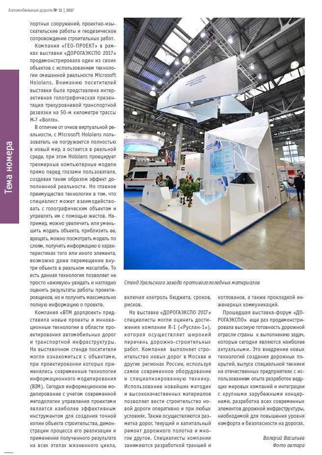 Компания «ВТМ дорпроект» представила новые проекты и инновационные технологии в области проектирования автомобильных дорог и транспортной инфраструктуры. На выставочном стенде посетители могли ознакомиться с объектами, при проектировании которых были применены современные технологии информационного моделирования (BIM).