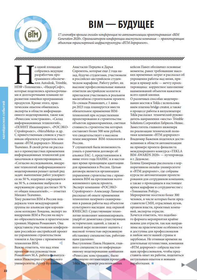 17 сентября прошла онлайн - конференция по автоматизации проектирования «BIM Generation 2020». Организатором конференции выступила компания – проектировщик объектов транспортной инфраструктуры «ВТМ дорпроект». На одной площадке собрались ведущие разработчики программного обеспечения Autodesk, Trimble, НПФ «Топоматик», «ИндорСофт», которые поделились краткосрочными и долгосрочными планами по развитию линейки программных продуктов. Кроме этого, практическим опытом обменялись эксперты в области информационного моделирования, такие как «Ренессанс констракшн», «Склад информационных технологий», «ПОИНТ Инжиниринг», «РОСЭКО-Стройпроект», «МегаМейд» и др.