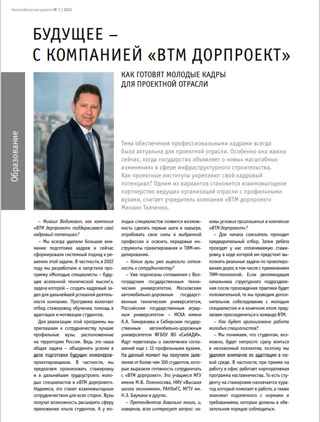 Тема обеспечения профессиональными кадрами всегда была актуальна для проектной отрасли. Особенно она важна сейчас, когда государство объявляет о новых масштабных изменениях в сфере инфраструктурного строительства. Как проектные институты укрепляют свой кадровый потенциал? Одним из вариантов становится взаимовыгодное партнерство ведущих организаций отрасли с профильными вузами, считает учредитель компании «ВТМ дорпроект» Михаил Ткаченко.