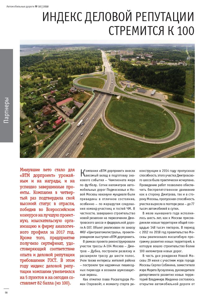 Минувшее лето стало для «ВТМ дорпроект» урожайным и на награды, и на успешно завершенные проекты. Компания в четвертый раз подтвердила свой высокий статус в отрасли, победив во Всероссийском конкурсе на лучшую проектную, изыскательскую организацию и фирму аналогичного профиля за 2017 год. Кроме того, предприятие получило сертификат, удостоверяющий соответствие опыта и деловой репутации требованиям ГОСТ. В этом году индекс деловой репутации компании увеличился на 5 пунктов и на сегодня составляет 82 балла (из 100).