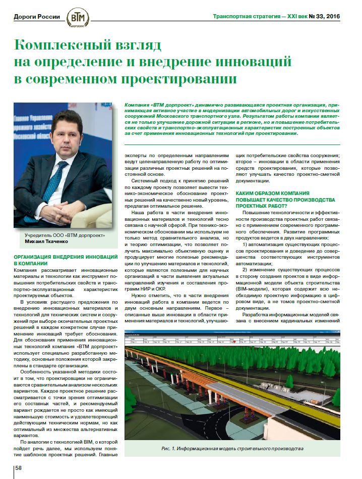 Компания «ВТМ дорпроект» - динамично развивающаяся проектная организация, принимающая активное участие в модернизации автомобильных дорог и искусственных сооружений московского транспортного узла. Результатом работы компании является не только улучшение дорожной ситуации в регионе, но и повышение потребительских свойств и транспортно-эксплуатационных характеристик построенных объектов за счет применения инновационных технологий при проектировании.