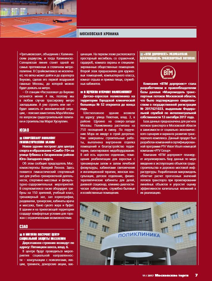 Компания «ВТМ дорпроект» стала разработчиком и правообладателем базы данных «Макромодель транспортных потоков Московской области», что было подтверждено свидетельством о государственной регистрации №2017621023, выданным Федеральной службой по интеллектуальной собственности 12 сентября 2017 года.