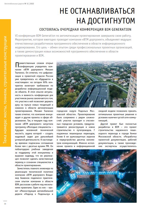VI конференция BIM Generation по автоматизации проектирования завершила свою работу. Мероприятие, которое ежегодно проводит компания «ВТМ дорпроект», объединяет ведущих отечественных разработчиков программного обеспечения в области информационного моделирования. Его цель – обмен опытом среди профессиональных проектных организаций, а также демонстрация новых возможностей программного обеспечения в области проектирования и BIM.