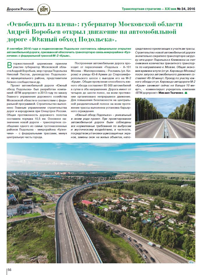 Проект автомобильной дороги «Южный обход Подольска» был разработан компанией «ВТМ дорпроект» в 2013 году по заказу Главного управления дорожного хозяйства Московской области в соответствии с федеральной программой. Строительство выполнено Главным управлением строительства дорог и аэродромов при Спецстрое России. Общая протяженность дорожного полотна составила порядка 10,5 км. Основное на- значение новой дороги – транспортное сообщение одного из самых густонаселенных районов Подольска – микрорайона «Кузнечики» – с федеральными трассами, минуя центральную часть города. Построенная автомобильная дорога про- ходит от пересечения «Подольск – А-101 Москва – Малоярославец – Рославль (ул. Кирова) и улицы 43-й Армии до Старосимферопольского шоссе с выходом его на М-2 «Крым».