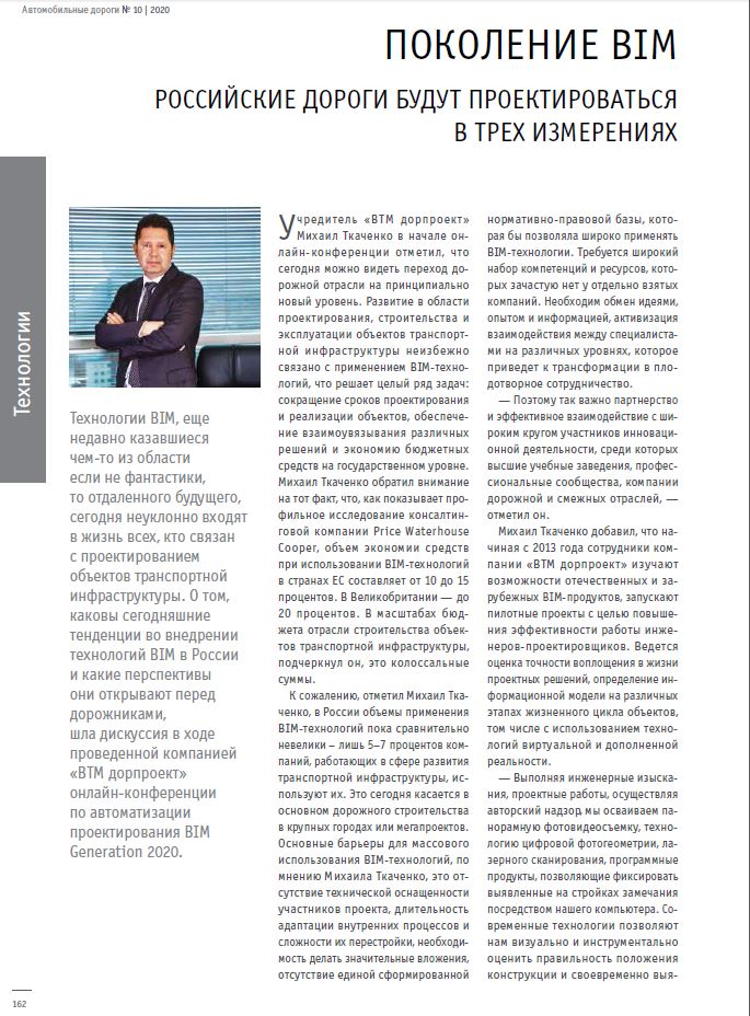 Технологии BIM, еще недавно казавшиеся чем-то из области если не фантастики, то отдаленного будущего, сегодня неуклонно входят в жизнь всех, кто связан с проектированием объектов транспортной инфраструктуры. О том, каковы сегодняшние тенденции во внедрении технологий BIM в России и какие перспективы они открывают перед дорожниками, шла дискуссия в ходе проведенной компанией "ВТМ дорпроект" онлайн-конференции по автоматизации проектирования BIM GENERATION 2020.