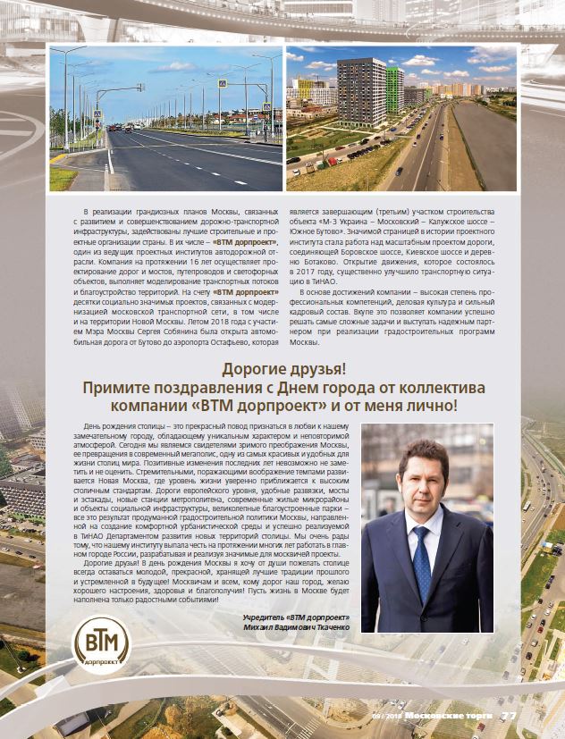 День рождения столицы – это прекрасный повод признаться в любви к нашему замечательному городу, обладающему уникальным характером и неповторимой атмосферой. Сегодня мы являемся свидетелями зримого преображения Москвы, ее превращения в современный мегаполис, одну из самых красивых и удобных для жизни столиц мира. Позитивные изменения последних лет невозможно не заметить и не оценить. Стремительными, поражающими воображение темпами развивается Новая Москва, где уровень жизни уверенно приближается к высоким столичным стандартам. Дороги европейского уровня, удобные развязки, мосты и эстакады, новые станции метрополитена, современные жилые микрорайоны и объекты социальной инфраструктуры, великолепные благоустроенные парки - все это результат продуманной градостроительной политики Москвы, направленной на создание комфортной урбанистической среды и успешно реализуемой в ТиНао Департаментом развития новых территорий столицы. Мы очень рады тому, что нашему институту выпала честь на протяжении многих лет работать в главном городе России, разрабатывая и реализуя значимые для москвичей проекты...