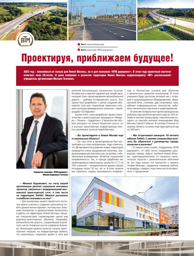 2022 год – юбилейный не только для Новой Москвы, но и для компании «ВТМ дорпроект». В этом году проектный институт отмечает свое 20-летие. О роли компании в развитии территории Новой Москвы корреспонденту «МТ» рассказывает учредитель организации Михаил Ткаченко.