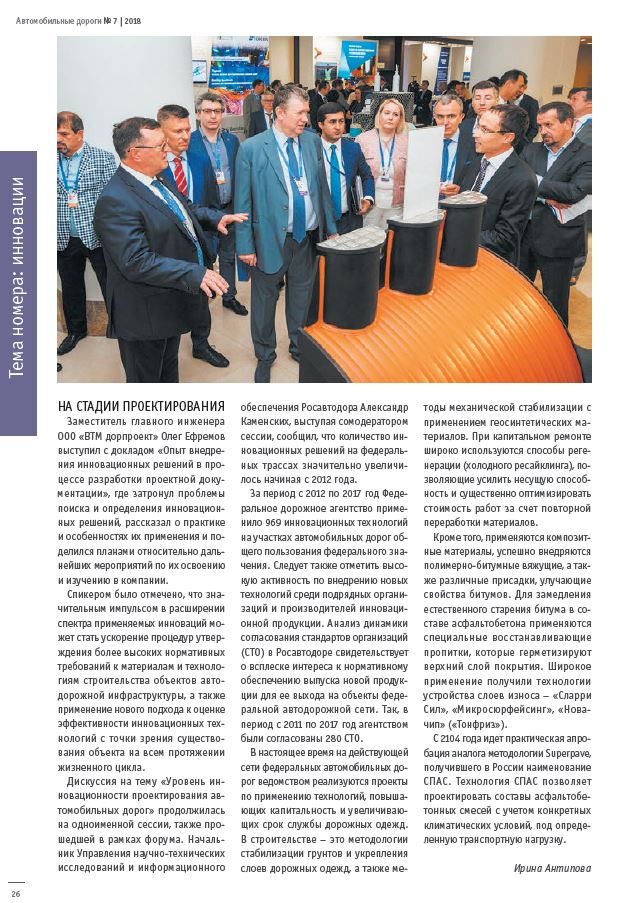 ...Заместитель главного инженера ООО "ВТМ дорпроект" Олег Ефремов выступил с докладом "Опыт внедрения инновационных решений в процессе разработки проектной документации", где затронул проблемы поиска и определения инновационных решений, рассказал о практике и особенностях их применения и поделился планами относительно дальнейших мероприятий по их освоению и изучению..."