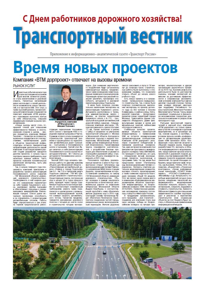 Известные события начала года стали настоящим испытанием для многих сегментов рынка, не стала исключением и дорожная отрасль. Проектные организации давно используют в своей деятельности возможности новых технологий и в частности, BIM. Этот опыт, а также высокий уровень профессиональной компетенции специалистов помогает компании «ВТМ дорпроект» планомерно выполнять взятые на себя обязательства, сохраняя лидирующие позиции на рынке проектирования.