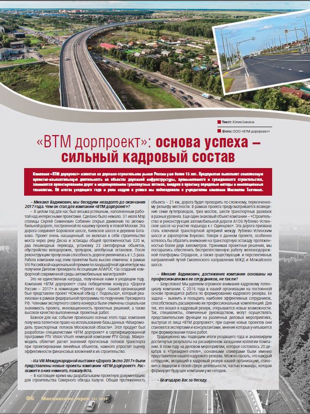 Компания «ВТМ дорпроект» известна на дорожно-строительном рынке России уже более 15 лет. Предприятие выполняет комплексную проектно-изыскательскую деятельность на объектах дорожной инфраструктуры, промышленного и гражданского строительства, занимается проектированием дорог и моделированием транспортных потоков, внедряя в практику передовые методы и инновационные технологии. Об итогах уходящего года и роли кадров в успехе мы побеседовали с учредителем компании Михаилом Ткаченко.