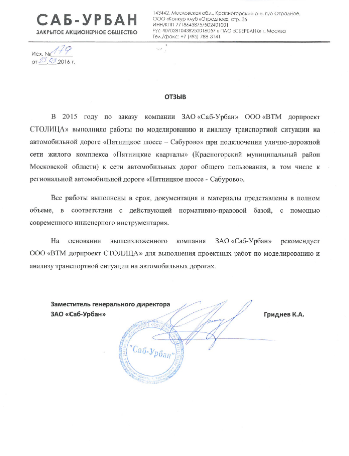На основании вышеизложенного ЗАО «Саб-Урбан» рекомендует ООО «ВТМ дорпроект СТОЛИЦА» для выполнения проектных работ по моделированию и анализу транспортной ситуации на автомобильных дорогах.