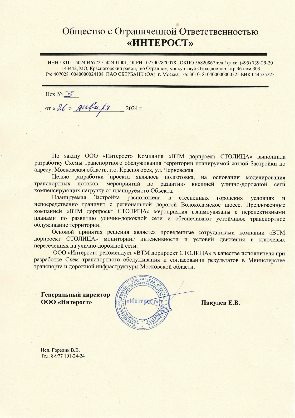 ООО "Интерост" рекомендует "ВТМ дорпроект СТОЛИЦА" в качестве исполнителя при разработке схем транспортного обслуживания и согласования результатов в Министерстве транспорта и дорожной инфраструктуры Московской области.