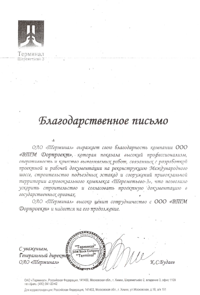 ОАО «Терминал» выражает свою благодарность компании ООО «ВТМ дорпроект», которая показала высокий профессионализм, оперативность и качество выполняемых работ, связанных с разработкой проектной и рабочей документации на реконструкцию Международного шоссе, строительство подъездных эстакад и сооружений привокзальной территории аэровокзального комплекса «Шереметьево-3», что позволило ускорить строительство и согласовать проектную документацию в государственных органах.