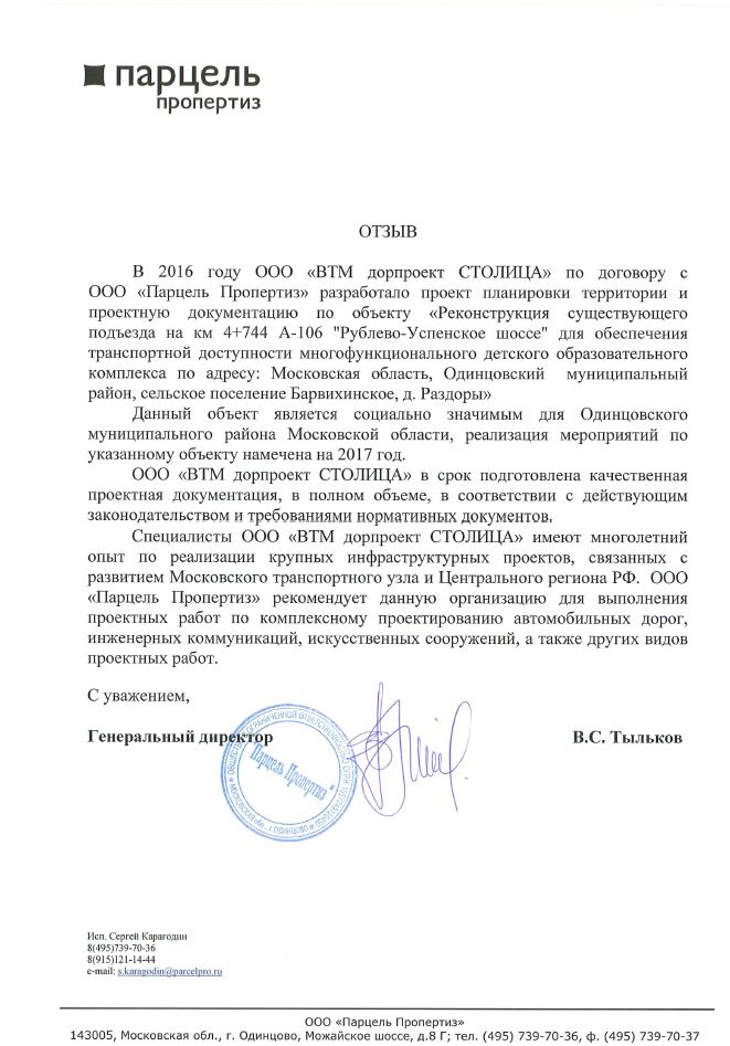 В 2016 году ООО "ВТМ дорпроект СТОЛИЦА" по договору с ООО "Парцель Пропертиз" разработало проект планировки территории и проектную документацию по объекту "Реконструкция существующего подъезда на км 4+744 А-106 “Рублево-Успенское шоссе” для обеспечения транспортной доступности многофункционального детского комплекса по адресу: Московская область Одинцовский муниципальный район, с/п Барвихинское".