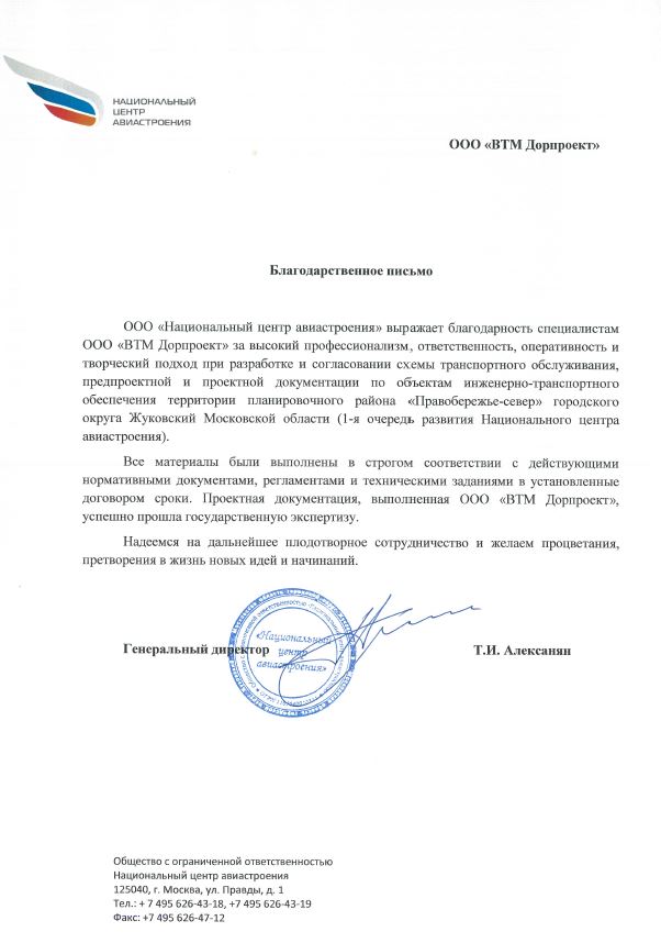 ООО "Национальный центр авиастроения" выражает благодарность специалистам ООО "ВТМ дорпроект" за высокий профессионализм, ответственность, оперативность и творческий подход при разработке и согласовании схемы транспортного обслуживания, предпроектной и проектной документации по объектам инженерно-транспортного обеспечения территории планировочного района "Правобережье-север" городского округа Жуковский Московской области (1-я очередь развития Национального центра авиастроения).