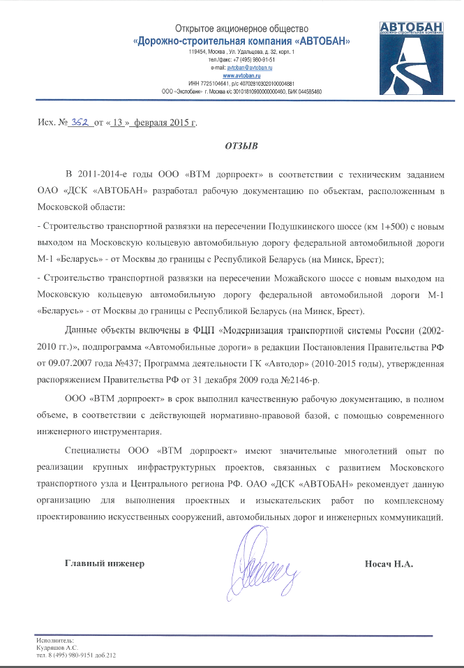 В 2011-2014-е годы ООО «ВТМ дорпроект» в соответствии с техническим заданием ОАО «ДСК «АВТОБАН» разработало рабочую документацию по объектам, расположенным в Московской области: