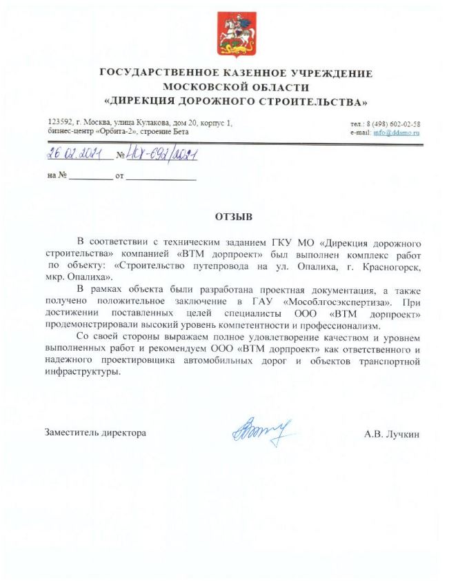 В соответствии с техническим заданием ГКУ МО «Дирекция дорожного строительства» компанией «ВТМ дорпроект» был выполнен комплекс работ по объекту: «Строительство путепровода на ул. Опалиха, г. Красногорск, мкр. Опалиха». В рамках объекта были разработаны проектная документация, а также получено положительное заключение в ГАУ "Мособлгосэкспертиза". При достижении поставленных целей специалисты ООО «ВТМ дорпроект» продемонстрировали высокий уровень компетентности и профессионализм....