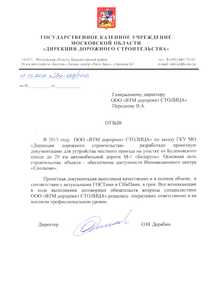 ...Проектная документация выполнена качественно и в полном объеме, в соответствии с актуальными ГОСТами и СНиПами, в срок. Все возникающие в ходе выполнения договорных обязательств вопросы специалистами Компании «ВТМ дорпроект» решались оперативно, ответственно и на высоком профессиональном уровне.