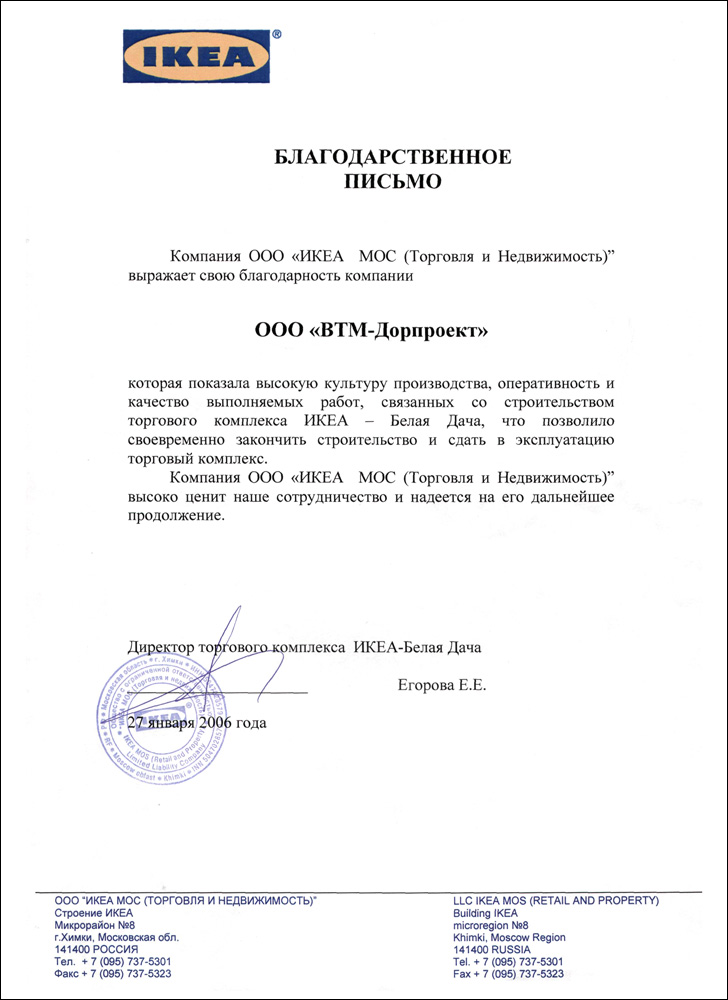 Компания ООО «ИКЕА МОС (Торговля и Недвижимость)» выражает свою благодарность компании ООО «ВТМ-Дорпроект», которая показала высокую культуру производства, оперативность и качество выполняемых работ, связанных со строительством торгового комплекса ИКЕА - Белая Дача, что позволило своевременно закончить строительство и сдать в эксплуатацию торговый комплекс.